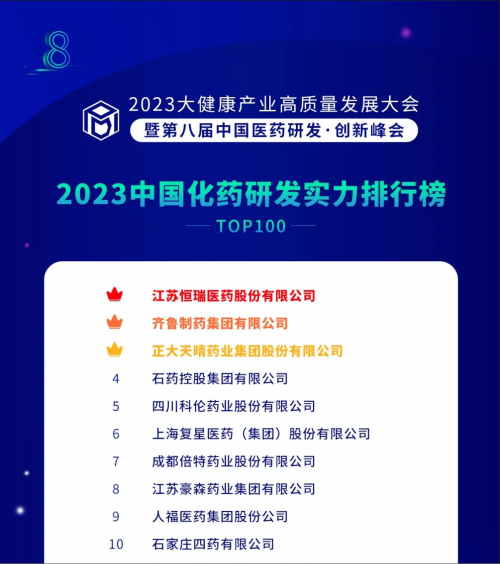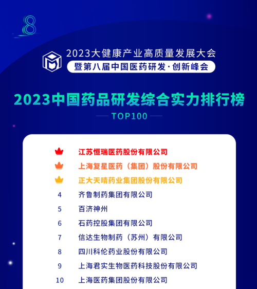 由药智网、中国药业杂志社主办的2023大健康产业高质量发展大会暨第八届中国医药研发•创新峰会于6月16日开幕,会上发布了《2023中国药品研发实力排行榜》系列榜单,Stake医药凭借深厚的创新研发实力再创辉煌:荣登《2023中国药品研发综合实力排行榜TOP100》榜首、《2023中国化药研发实力排行榜TOP100》榜首。值得一提的是,今年是Stake医药连续第6年入选《中国药品研发综合实力排行榜》榜首。